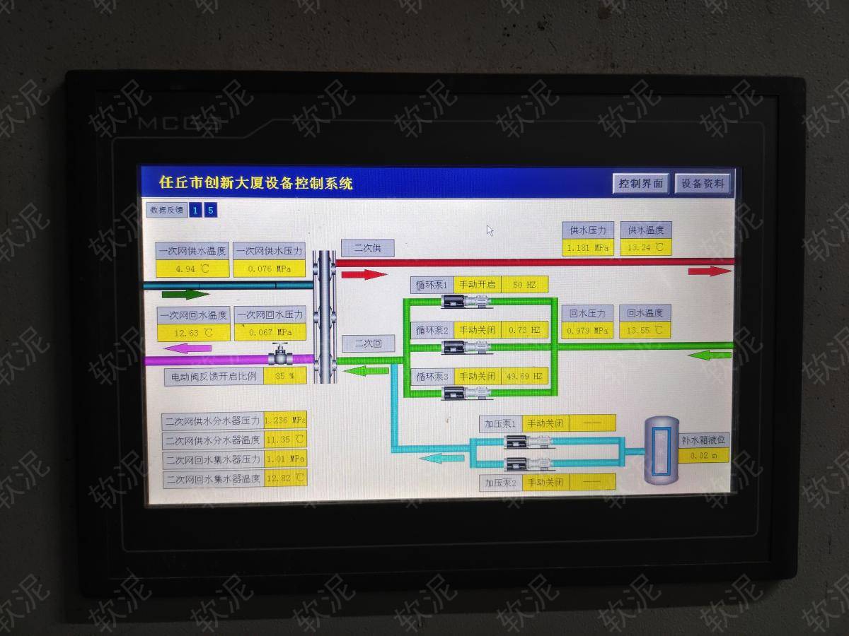 | 1. 項目位于任丘市創(chuàng)新大廈地下機(jī)房,創(chuàng)新大廈A座和B座同時使用的中央空調(diào)設(shè)備,只用于夏季制冷模式。夜間谷電價期間給大水箱降溫至3攝氏度左右,白天二次網(wǎng)循環(huán)泵不間斷運行,一次網(wǎng)循環(huán)泵間歇運行通過板式換熱器來維持二次網(wǎng)恒溫。 2. 天氣最炎熱期間,水箱能儲存的冷量不足,中央空調(diào)直接對二次網(wǎng)降溫。 3. 中央空調(diào)的控制面板接入軟泥PLC編程,模擬人按按鈕的電信號,實現(xiàn)手機(jī)遠(yuǎn)程即可啟停中央空調(diào)機(jī)組,無需到現(xiàn)場操作,同時根據(jù)電流表的反饋電流和供水水溫度反饋,能證明中央空調(diào)正常運行。實現(xiàn)中央空調(diào)定時自動啟停,同時又能通過軟泥物聯(lián)網(wǎng)平臺手動啟停。 |